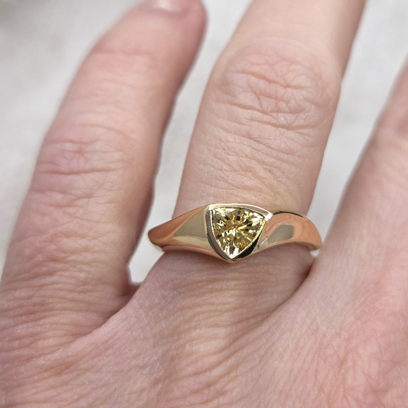 This 14k yellow gold ring features a .75 carat trillion cut yellow sapphire, set in a sleek yellow gold bezel with a clean, modern profile. The bezel setting frames the sapphire smoothly and securely, allowing the warm yellow gold to naturally enhance the stone’s color. The sapphire is exceptionally well cut, throwing off lively flashes of light.