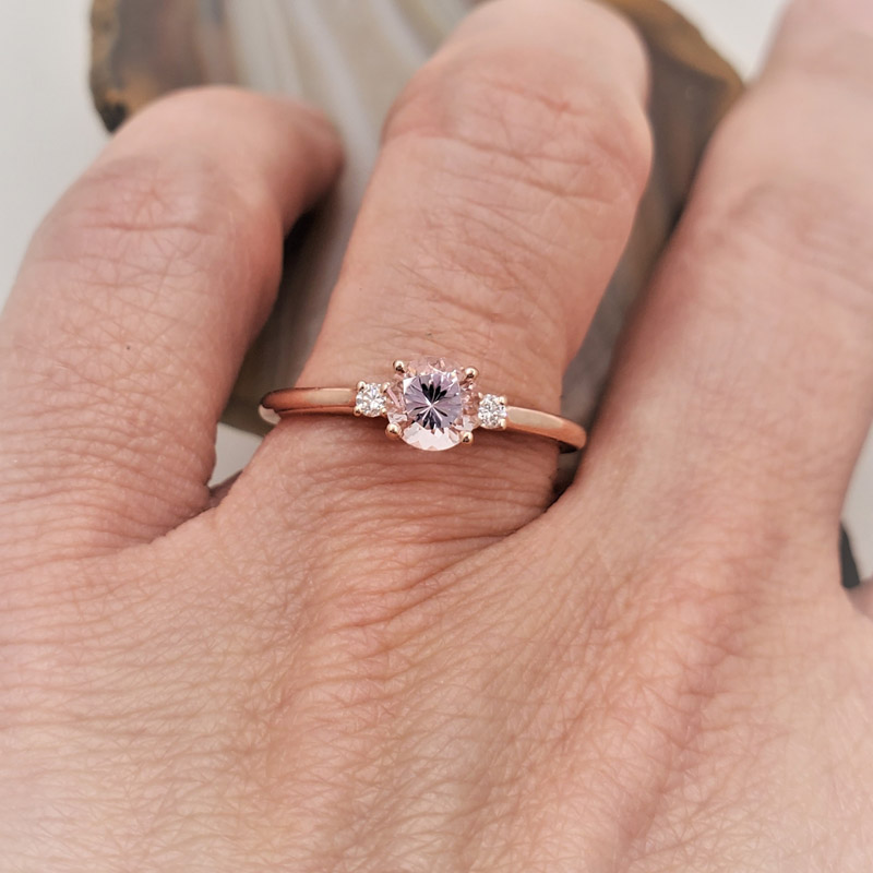 14k rose gold three stone ring set with round brilliant cut morganite and diamond accents. Morganite is 5mm, 1/2ct. Diamonds are round brilliant cut, SI clarity, 1.8mm each.