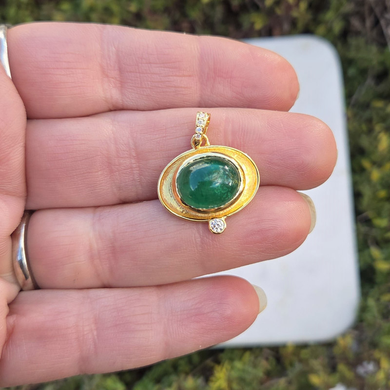 A striking 4.56 carat cabochon-cut emerald rests at the heart of this 14K yellow gold pendant. Its deep, lush green hue glows with a natural inner light, beautifully framed in a smooth bezel that enhances both color and contour.