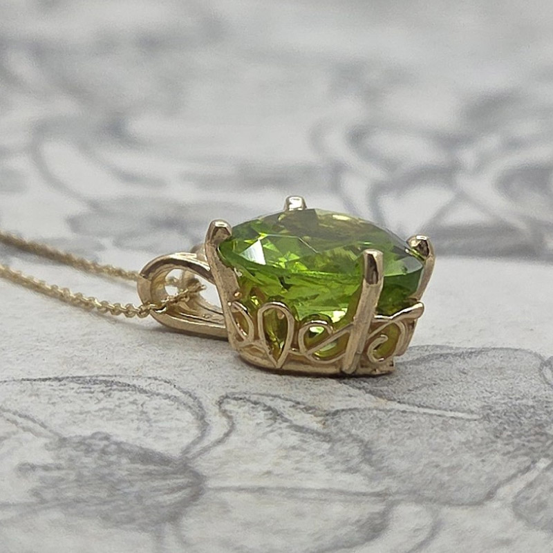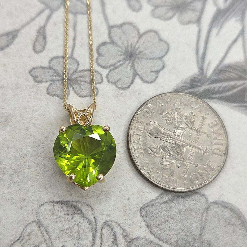 Bright as a crisp Granny Smith apple and full of life, this stunning 3.49 carat heart shaped peridot glows with vibrant spring green brilliance.