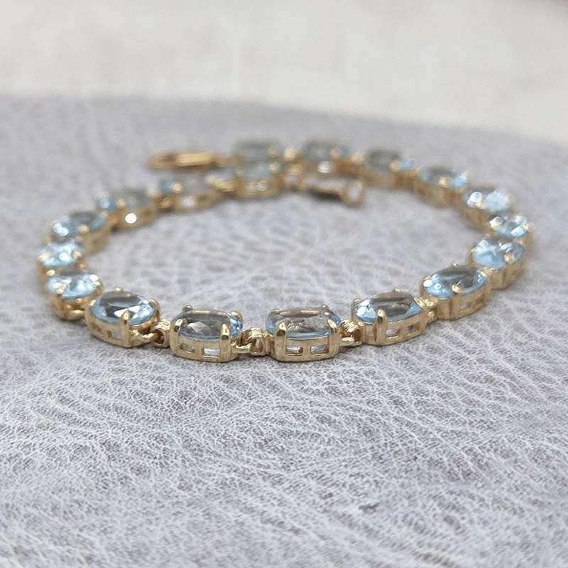 14k yellow gold blue topaz bracelet. Each stone is approximately 7x5mm, stones are well cut and eye clean. Excellent vintage condition. Timeless piece.