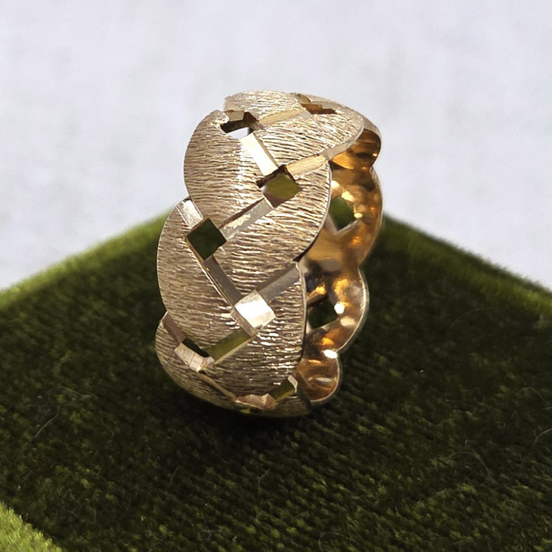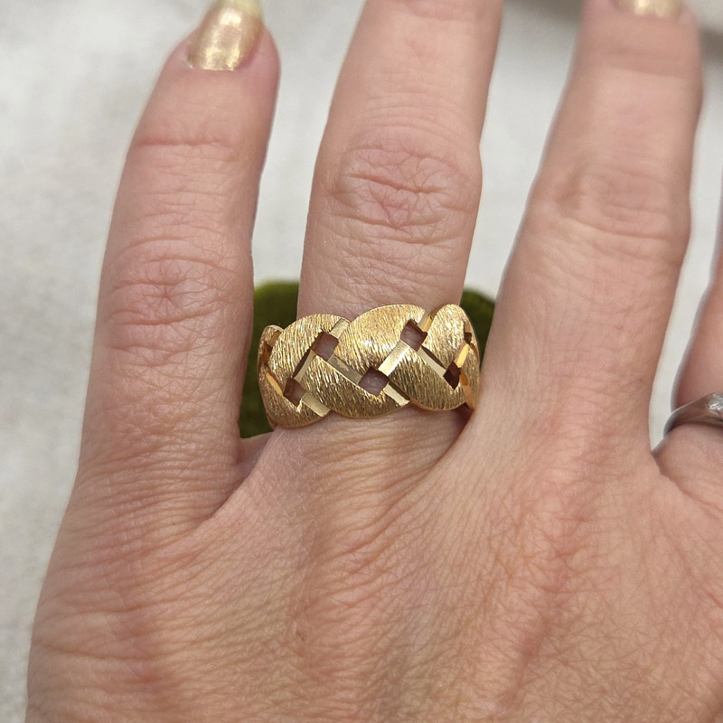 This elegant vintage 14K gold ring features a beautifully crafted continuous woven design that wraps seamlessly around the finger. The intricate texture and polished accents create a dynamic play of light, giving this piece both substance and sophistication. Measuring 9.5mm wide and weighing 7.7 grams, it has a substantial feel without being bulky. Its warm golden hue and intricate openwork pattern make it perfect for daily wear or as a distinctive wedding band, or stacking piece.
