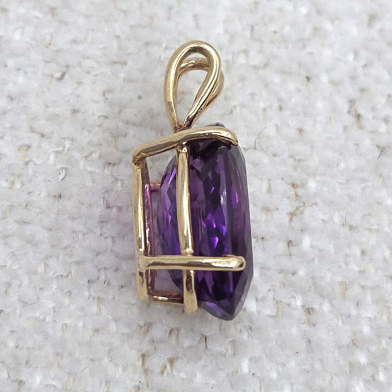 A striking vintage pendant featuring a richly colored amethyst with deep purple tones and flashes of red, set in a classic 14K (hallmark on the side of the bail) yellow gold basket setting. The elongated oval gemstone measures 16mm x 11mm, with estimated weight of 7cts. (stone is currently set making exact determinations of weight impossible).