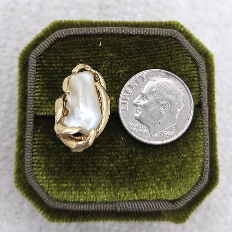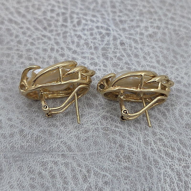 Elegant and timeless, these estate earrings feature luminous baroque pearls gracefully wrapped in sculpted 14k yellow gold. The organic gold design flows around each pearl, enhancing their natural shape and soft iridescence for a refined yet artistic look. Fitted with omega backs, a luxurious and secure style often found in fine estate jewelry. The hinged clip provides added comfort and stability, allowing the earrings to sit beautifully on the ear without drooping.
