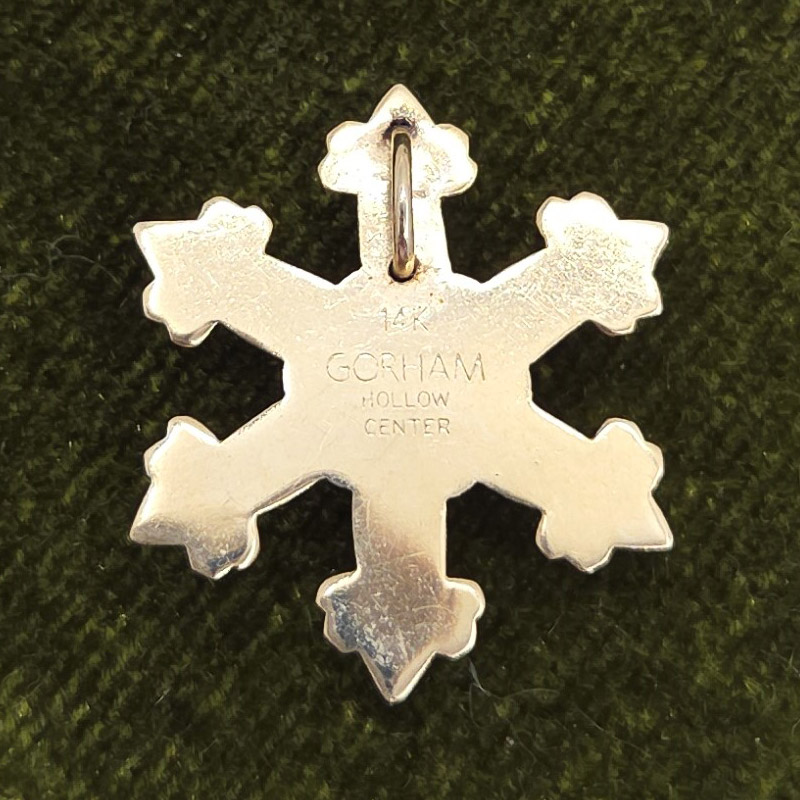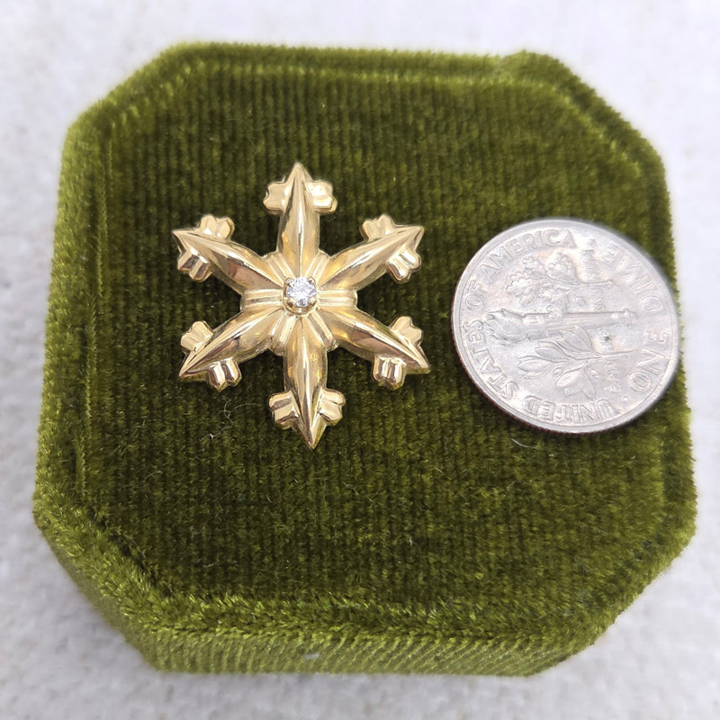 A charming touch of winter sparkle. This vintage Gorham snowflake pendant is finely crafted in 14k yellow gold. The design is fully three-dimensional, showcasing crisp, sculpted details that capture the elegance of a real snowflake. At its center sparkles a 2mm round brilliant cut diamond, adding just the right touch of shimmer.