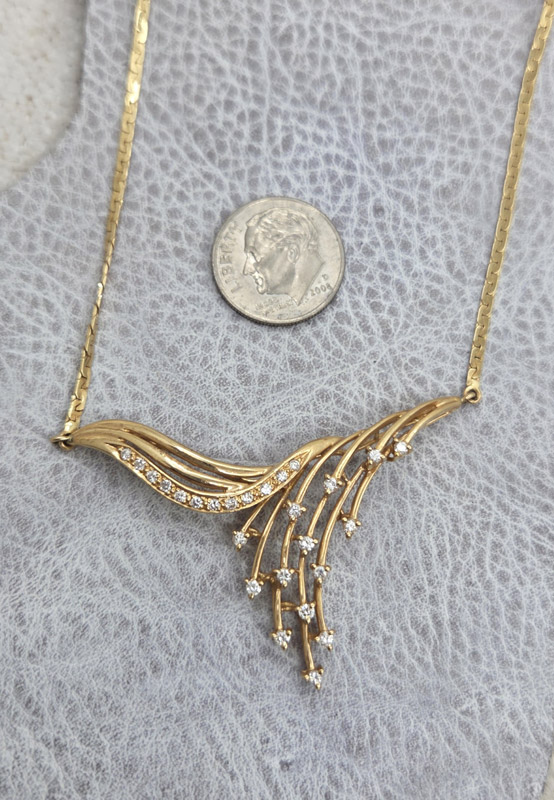 This elegant estate 14k yellow gold necklace captures movement and grace in its design, with 26 round brilliant-cut diamonds that seem to cascade downward like falling stars. The diamonds sparkle along sweeping gold lines that create a fluid, modern silhouette.
