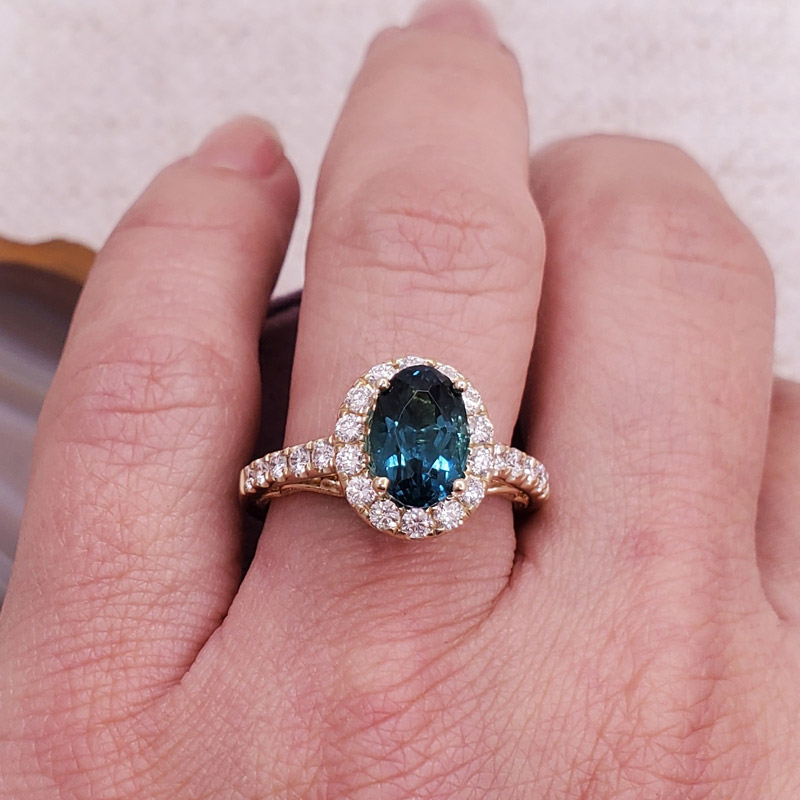 Mount Mica "Ocean Blue" tourmaline in diamond halo ring.