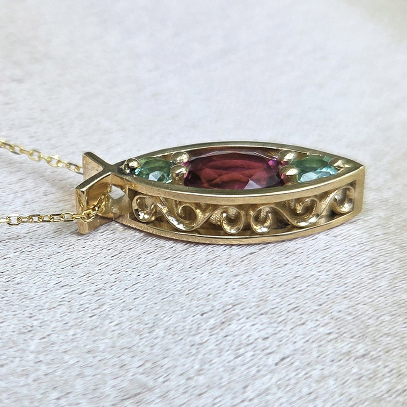This 14k yellow gold pendant showcases the beauty of two historic Maine gem localities. The centerpiece is a 1.28ct pink tourmaline from the Dunton Quarry in Newry, Maine, paired with two sparkling green tourmalines from Mount Apatite in Auburn, Maine.