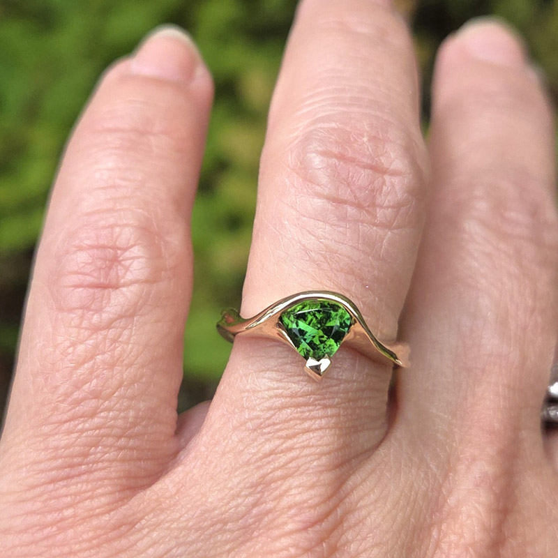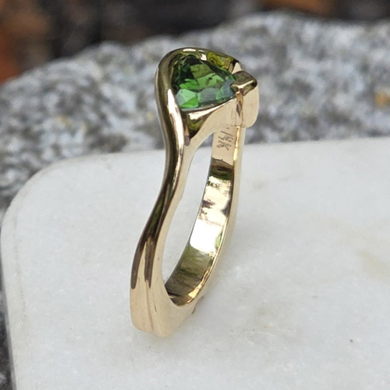 This graceful ring is crafted in 14K gold and set with a trillion .75 ct green tourmaline, mined in Maine.