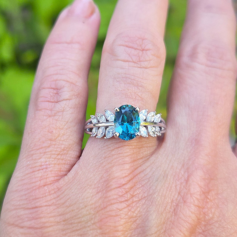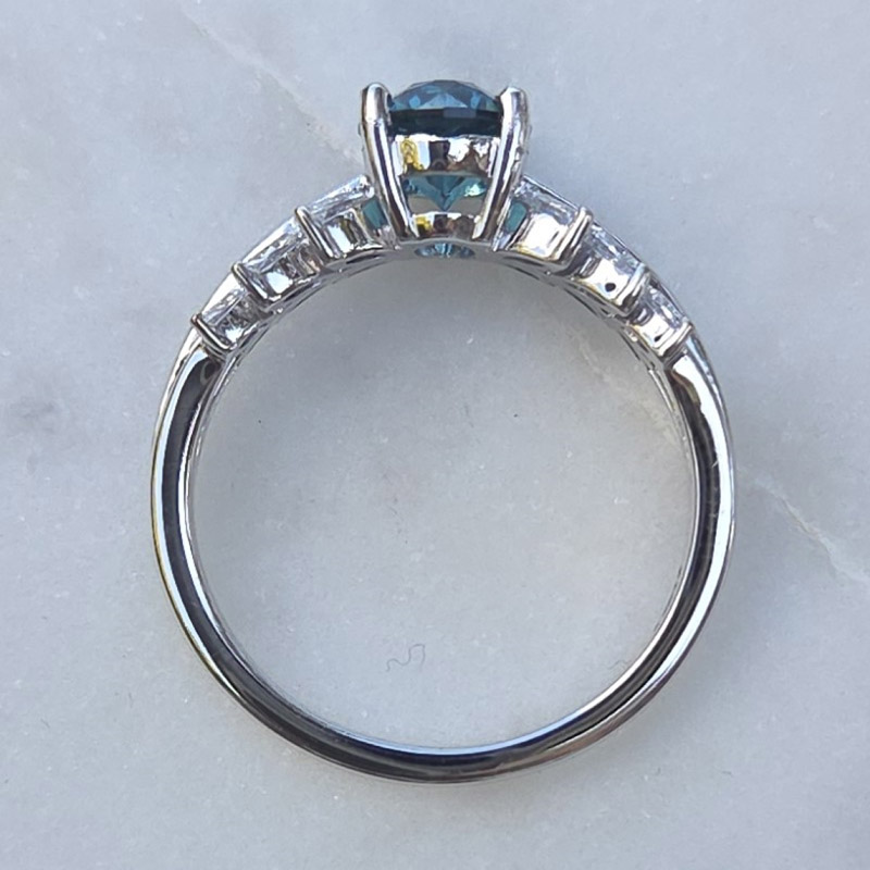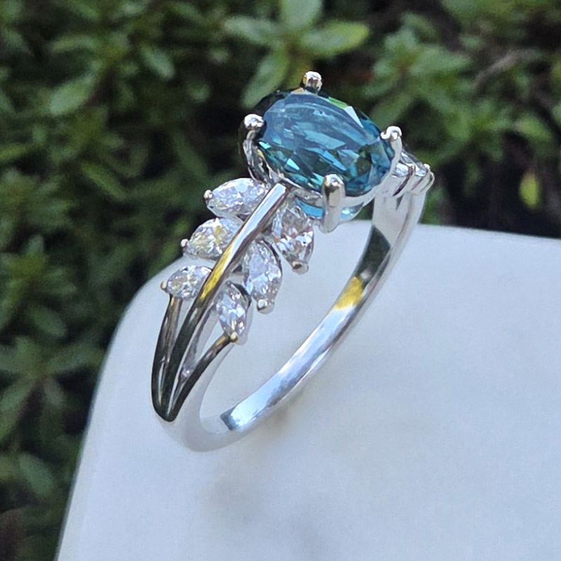 This 14k white gold ring is designed to capture attention with its rare beauty. At the center is a 1.27ct Ocean Blue tourmaline, mined from the Mount Mica Quarry in Maine. The gem’s vivid, watery blue hue and precision cut give it both brilliance and a serene, timeless presence.