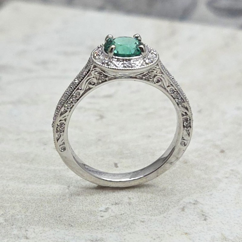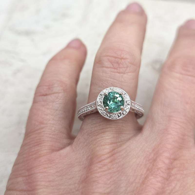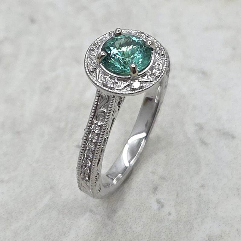 The combination of mint green tourmaline, white gold, diamond accents, scrollwork, and milgrain creates a ring with both presence and fine detail, elegant without being overstated. A distinctive statement ring and a beautiful choice for a unique engagement ring.